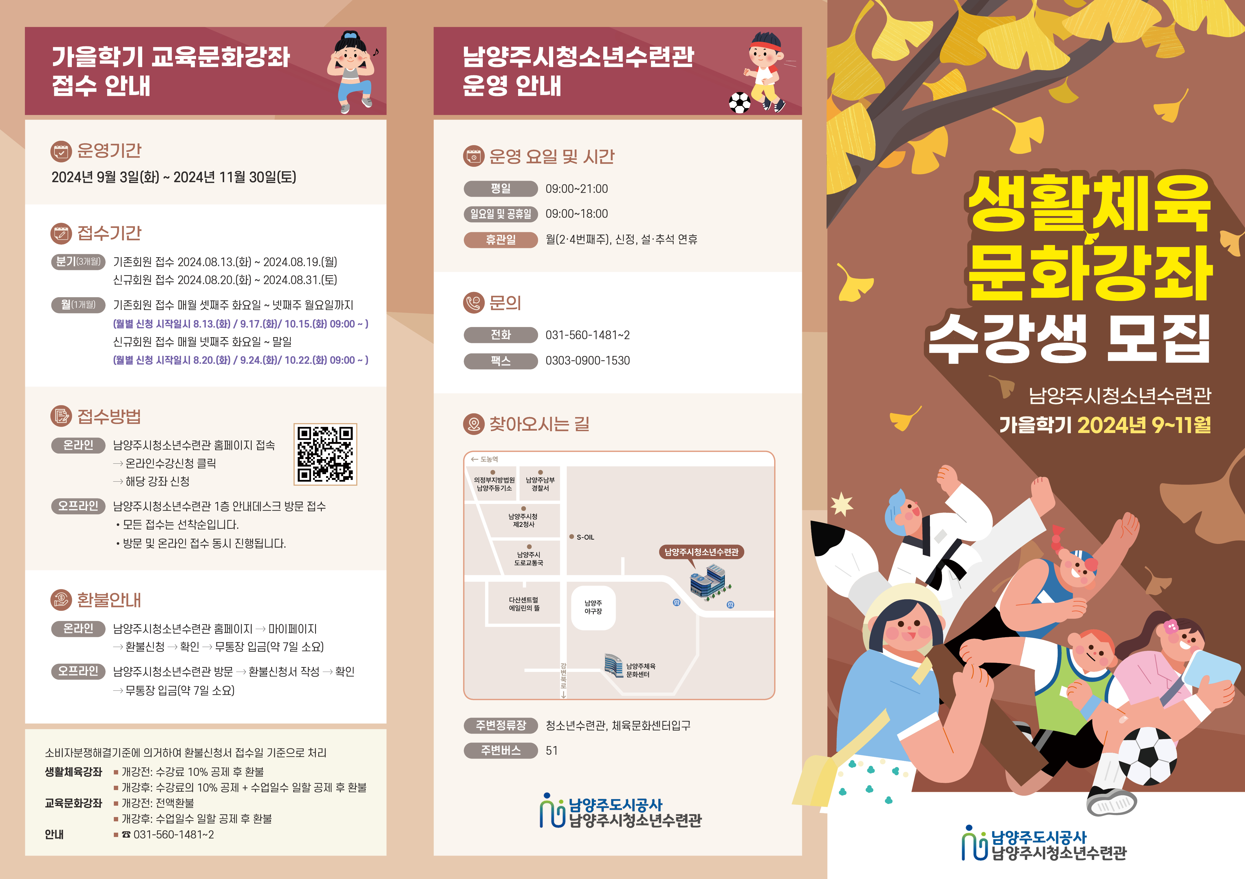 청소년수련관 2024년 가을학기 생활체육·교육문화강좌 모집 안내 작성자 청소년수련관 등록일자 2024년 8월 9일 9시 18분 26초 조회 431 2024년 남양주시청소년수련관_가을학기_안내1.jpg [ Size : 2.88MB, Down : 332 ] 미리보기 다운로드 2024년 남양주시청소년수련관_가을학기_안내2.jpg [ Size : 3.94MB, Down : 324 ] 미리보기 다운로드 목록보기