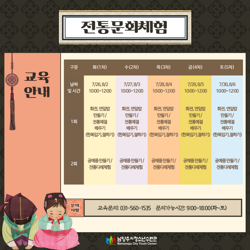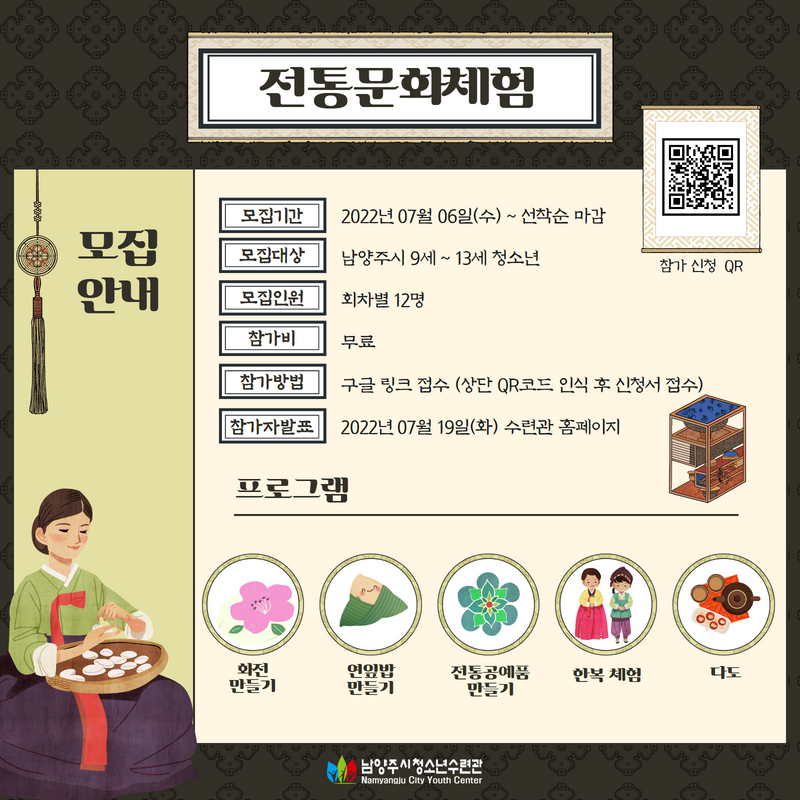 청소년수련관 [마감]2022년 전통문화체험 모집 안내 작성자 청소년수련관 등록일자 2022년 7월 6일 0시 0분 0초 조회 475 전통문화체험안내 2.png [ Size : 423.67KB, Down : 408 ] 미리보기 다운로드 01.png [ Size : 517.76KB, Down : 169 ] 미리보기 다운로드 목록보기
