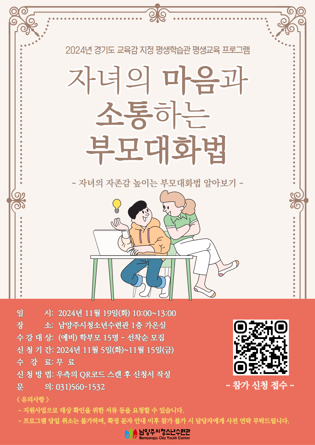 청소년수련관 남양주시청소년수련관 평생학습관 프로그램 자녀의 마음과 소통하는 부모대화법 참가자 모집 안내 작성자 청소년수련관 등록일자 2024년 11월 5일 14시 3분 31초 조회 324 남양주시청소년수련관 평생학습관 프로그램 자녀의 마음과 소통하는 부모대화법 참가자를 모집합니다.자세한 사항은 아래 홍보포스터를 참고부탁드리며, 문의는 031-560-1532로 부탁드립니다.감사합니다. 부모대화법 홍보포스터 최종.jpg [ Size : 974.32KB, Down : 171 ] 미리보기 다운로드 목록보기