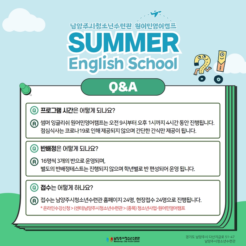 청소년수련관 2022년 여름방학 원어민영어캠프 모집 안내 작성자 청소년수련관 등록일자 2022년 7월 16일 0시 0분 0초 조회 753 [11] 영어캠프 2.jpg [ Size : 261.53KB, Down : 303 ] 미리보기 다운로드 목록보기