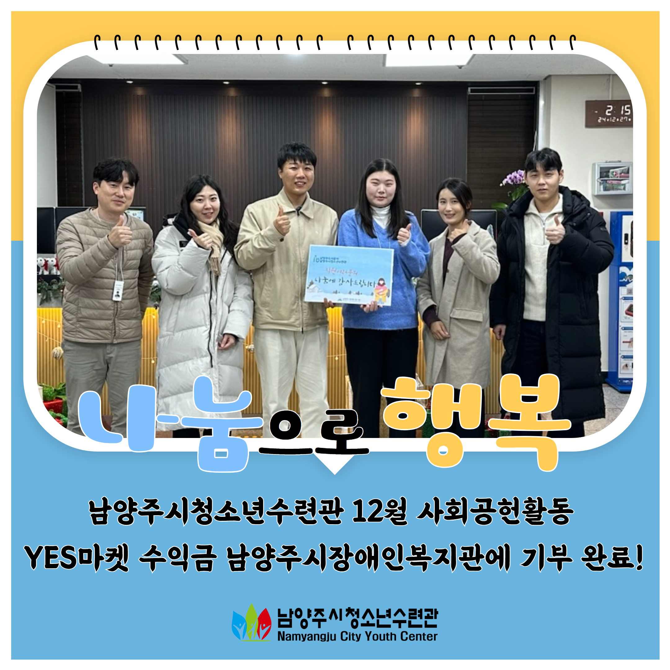 청소년수련관 12월 사회공헌활동 YES마켓 수익금 기부 결과 작성자 청소년수련관 등록일자 2024년 12월 28일 9시 24분 13초 조회 198 yes마켓 수익금기부.png [ Size : 4.18MB, Down : 94 ] 미리보기 다운로드 목록보기