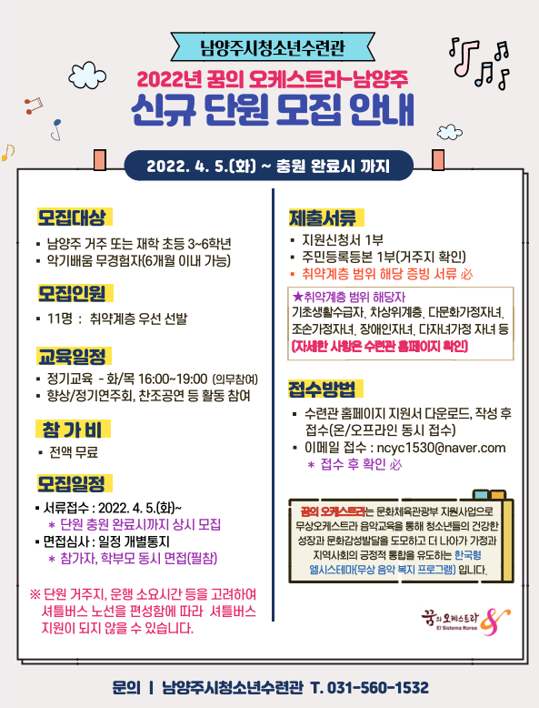 청소년수련관 2022년 꿈의 오케스트라 신규단원 추가 모집 안내 작성자 청소년수련관 등록일자 2022년 4월 6일 0시 0분 0초 조회 510 2022 지원신청서 (1).hwp [ Size : 99.5KB, Down : 491 ] 다운로드 20220406_195115.png [ Size : 168.33KB, Down : 341 ] 미리보기 다운로드 목록보기