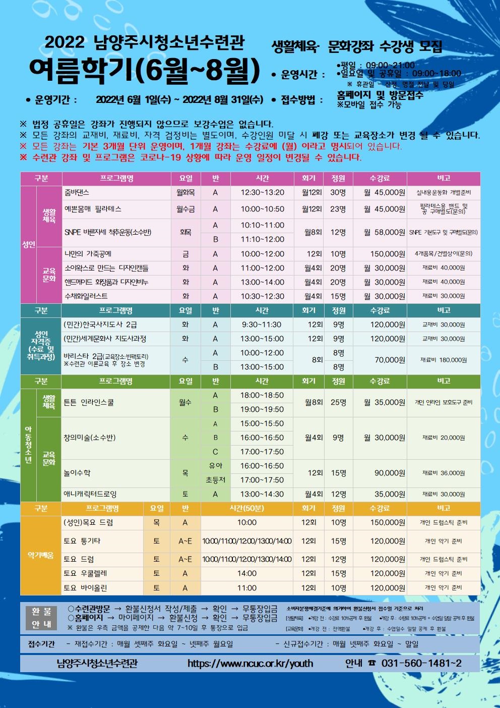 청소년수련관 [교육문화] 여름학기(6~8월) 생활체육·문화강좌 수강생 모집 작성자 청소년수련관 등록일자 2022년 5월 13일 0시 0분 0초 조회 586 01.jpg [ Size : 457.56KB, Down : 158 ] 미리보기 다운로드 목록보기