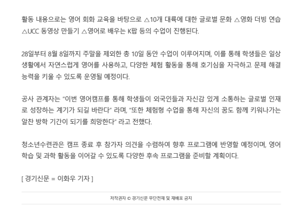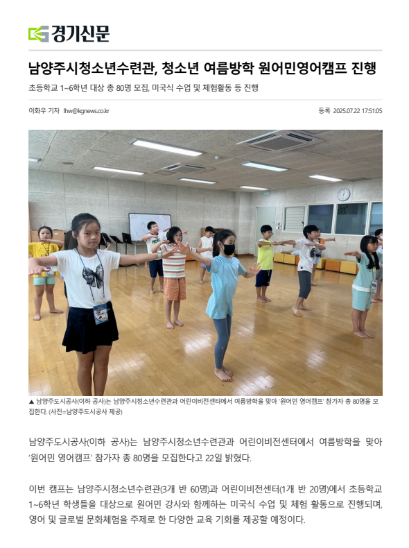2025.07. 남양주시청소년수련관, 청소년 여름방학 원어민영어캠프 진행 작성자 청소년수련관 등록일자 2025년 11월 26일 11시 47분 2초 조회 40 남양주시청소년수련관, 청소년 여름방학 원어민영어캠프 진행 남청수, 청소년 여름방학 원어민영어캠프 진행 (1).png [ Size : 459.2KB, Down : 19 ] 미리보기 다운로드 남청수, 청소년 여름방학 원어민영어캠프 진행 (2).png [ Size : 90.72KB, Down : 24 ] 미리보기 다운로드 목록보기