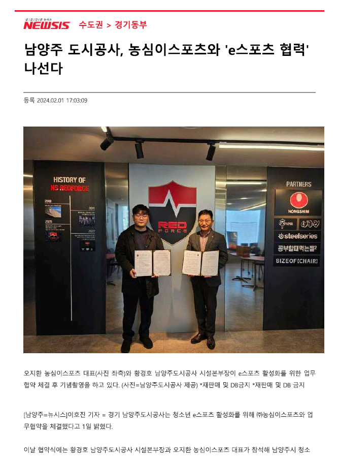 2024.02. 남양주도시공사 농심이스포츠와 e스포츠 협력 나선다. 작성자 청소년수련관 등록일자 2024년 12월 10일 15시 18분 12초 조회 109 남양주 도시공사, 농심이스포츠와 'e스포츠 협력' 나선다 (뉴시스) 2024. 02. 남양주도시공사 농심이스포츠와 e스포츠 협력 나선다..png [ Size : 431.78KB, Down : 87 ] 미리보기 다운로드 목록보기