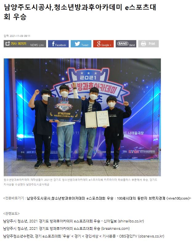 (2021.11.) 남양주도시공사, 청소년방과후아카데미 e스포츠대회 우승 작성자 청소년수련관 등록일자 2021년 11월 16일 0시 0분 0초 조회 456 <전문바로가기 : 남양주도시공사,청소년방과후아카데미 e스포츠대회 우승 : 100세시대의 동반자 브릿지경제 (viva100.com)> <관련보도>남양주시 청소년, 2021 경기도 방과후아카데미 e스포츠대회 우승 - 신아일보 (shinailbo.co.kr) 남양주시 청소년, 2021 경기도 방과후아카데미 e스포츠대회 우승 (breaknews.com) 남양주청소년수련관, 경기 e스포츠대회 '우승' < 경기 < 경인세상 < 기사본문 - OBS경인TV (obsnews.co.kr) e스포츠대회.JPG [ Size : 89.04KB, Down : 145 ] 미리보기 다운로드 목록보기