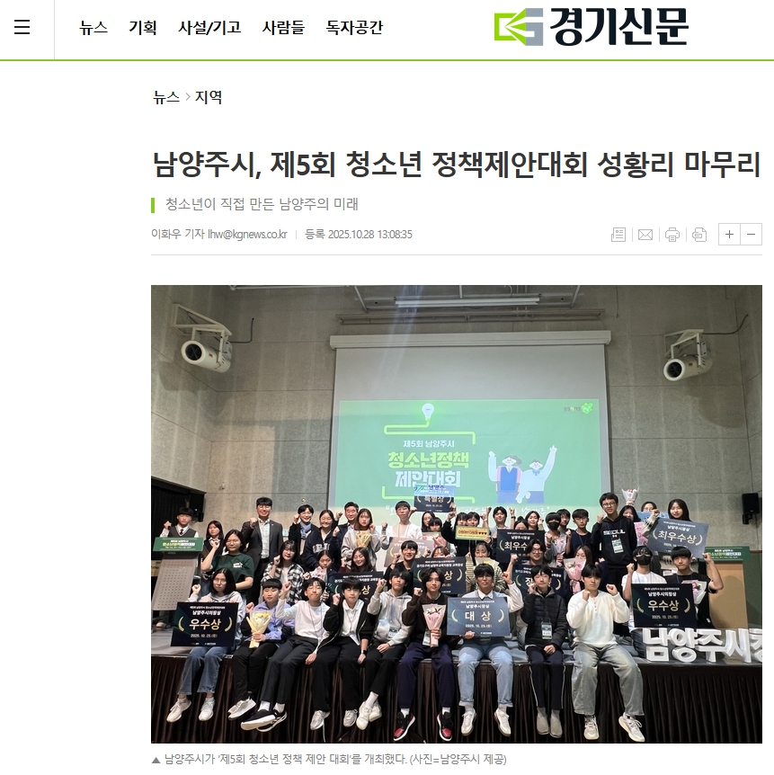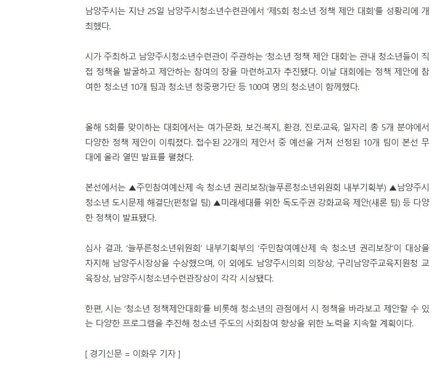 2025.10. 남양주시, 제5회 청소년정책제안대회 성황리 마무리 작성자 청소년수련관 등록일자 2025년 11월 26일 13시 12분 41초 조회 38 남양주시, 제5회 청소년 정책제안대회 성황리 마무리 정책제안대회1.jpg [ Size : 401.44KB, Down : 55 ] 미리보기 다운로드 정책제안대회2.jpg [ Size : 324.88KB, Down : 45 ] 미리보기 다운로드 목록보기