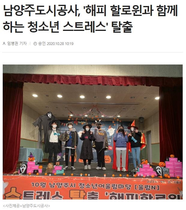 경기인터넷뉴스(2020.10.28.) 남양주도시공사, 해피 할로윈과 함께 하는 청소년 스트레스 탈출 운영:빠른뉴스 바른뉴스 경기인터넷뉴스 (ginnews.kr)