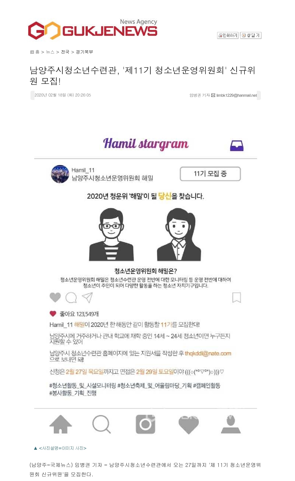 (2020.02.18.)남양주시청소년수련관, '제11기 청소년운영위원회' 신규위원 모집! 작성자 청소년수련관 등록일자 2020년 3월 18일 0시 0분 0초 조회 390 전문 하단 주소 참조http://www.gukjenews.com/news/articleView.html?idxno=1243372 01.jpg [ Size : 295.25KB, Down : 113 ] 미리보기 다운로드 목록보기