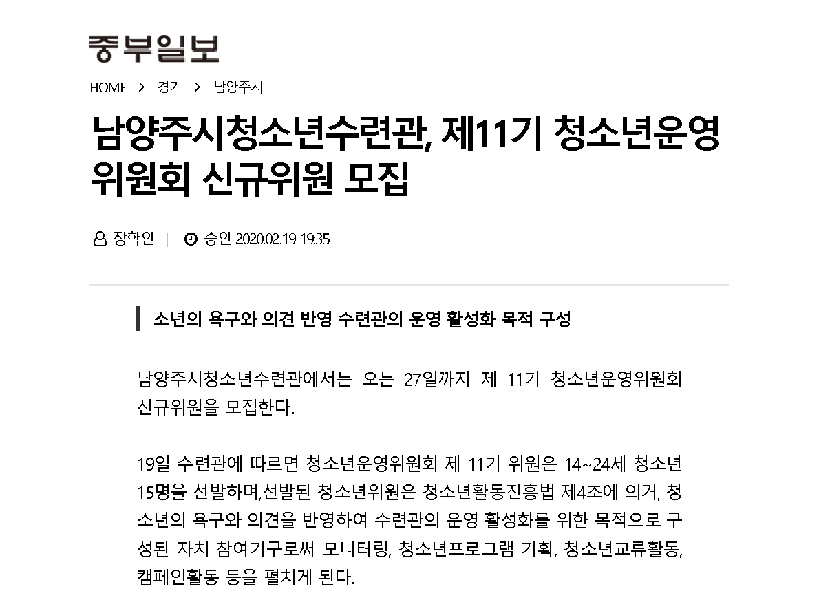 (2020.02.19.)남양주시청소년수련관, 제11기 청소년운영위원회 신규위원 모집 작성자 청소년수련관 등록일자 2020년 3월 18일 0시 0분 0초 조회 436 전문 하단 주소 참조http://www.joongboo.com/news/articleView.html?idxno=363400274 01.png [ Size : 37.11KB, Down : 98 ] 미리보기 다운로드 목록보기