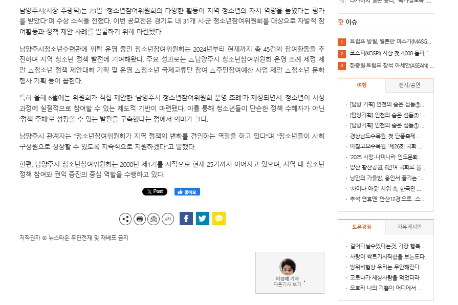 2025.10. 남양주시 청소년참여위원회, 우수사례 공모전서 경기도지사상 수상 작성자 청소년수련관 등록일자 2025년 11월 26일 13시 11분 40초 조회 48 남양주시 청소년참여위원회, 우수사례 공모전서 경기도지사상 수상 - 뉴스타운남양주시 청소년참여위원회, 경기도지사상 수상 < 경기 < Regions < 기사본문 - 퍼블릭뉴스통신(Public news-network for TTL)남양주시 청소년참여위원회, ‘경기도 청소년참여위원회 우수사례’ 경기도지사상 수상 청참위 수상1.jpg [ Size : 339.29KB, Down : 48 ] 미리보기 다운로드 청참위 수상2.jpg [ Size : 257.42KB, Down : 43 ] 미리보기 다운로드 목록보기