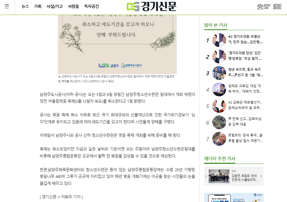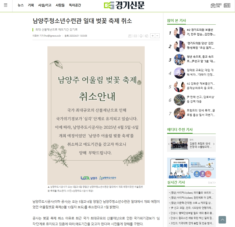 2025.04. 남양주시청소년수련관 일대 벚꽃 축제 취소 작성자 청소년수련관 등록일자 2025년 11월 26일 11시 32분 2초 조회 7 벚꽃 축제 취소 보도자료_1.jpg [ Size : 358.93KB, Down : 13 ] 미리보기 다운로드 벚꽃 축제 취소 보도자료_2.jpg [ Size : 302.42KB, Down : 11 ] 미리보기 다운로드 목록보기