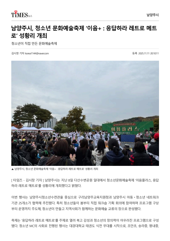 2025.11. 남양주시, 청소년 문화예술축제 이음플러스 응답하라 레트로 메트로 성황리 개최 작성자 청소년수련관 등록일자 2025년 11월 26일 13시 15분 0초 조회 56 남양주시, 청소년 문화예술축제 이음플러스 응답하라 레트로 메트로 성황리 개최 남양주시 청소년 문화예술축제 이음플러스 응답하라 레트로 메트로 성황리 개최 (2).png [ Size : 364.5KB, Down : 61 ] 미리보기 다운로드 남양주시 청소년 문화예술축제 이음플러스 응답하라 레트로 메트로 성황리 개최 (1).png [ Size : 55.32KB, Down : 52 ] 미리보기 다운로드 목록보기