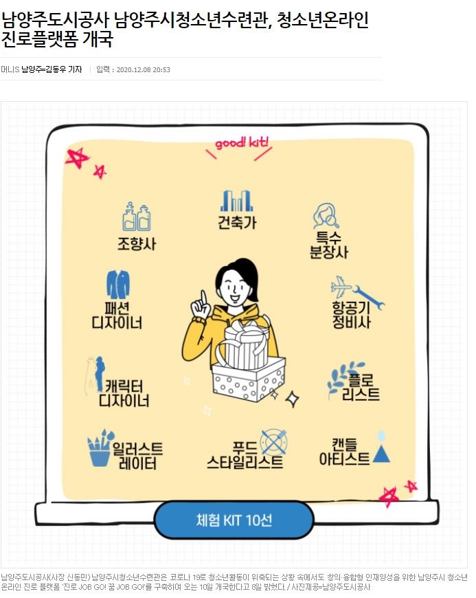 <전문 바로가기 : 남양주도시공사 남양주시청소년수련관, 청소년온라인진로플랫폼 개국 - 머니S (mt.co.kr)>