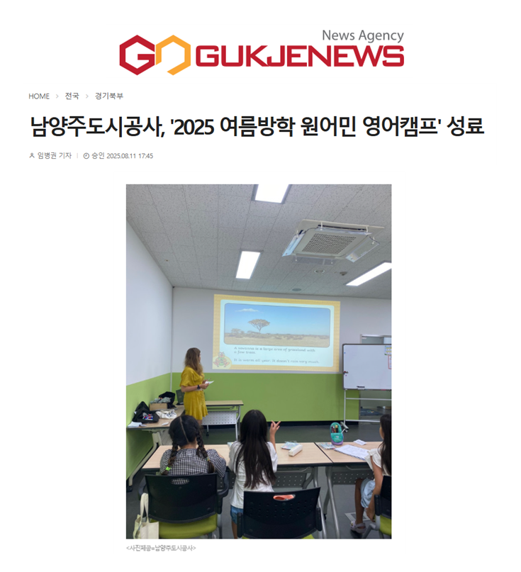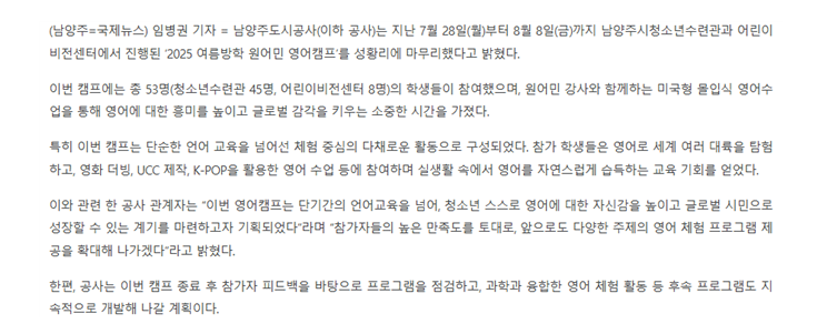 2025.08. 남양주도시공사, 2025 여름방학 원어민 영어캠프 성료 작성자 청소년수련관 등록일자 2025년 11월 26일 13시 2분 36초 조회 33 남양주도시공사, '2025 여름방학 원어민 영어캠프' 성료 남양주도시공사 2025 여름방학 원어민 영어캠프 성료 (1) (1).png [ Size : 366.43KB, Down : 33 ] 미리보기 다운로드 남양주도시공사 2025 여름방학 원어민 영어캠프 성료 (2) (1).png [ Size : 146.99KB, Down : 31 ] 미리보기 다운로드 목록보기