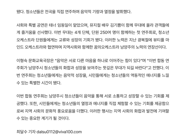 2025.09. 남양주시, 청소년 오케스트라 합동 연주회 성료...250명이 함께한 감동 작성자 청소년수련관 등록일자 2025년 11월 26일 13시 9분 36초 조회 27 남양주시, 청소년 오케스트라 합동 연주회 성료...250명이 함께한 감동 남양주시, 청소년 오케스트라 합동 연주회 성료...250명이 함께한 감동 (1).png [ Size : 450.84KB, Down : 36 ] 미리보기 다운로드 남양주시, 청소년 오케스트라 합동 연주회 성료...250명이 함께한 감동 (2).png [ Size : 119.5KB, Down : 26 ] 미리보기 다운로드 목록보기
