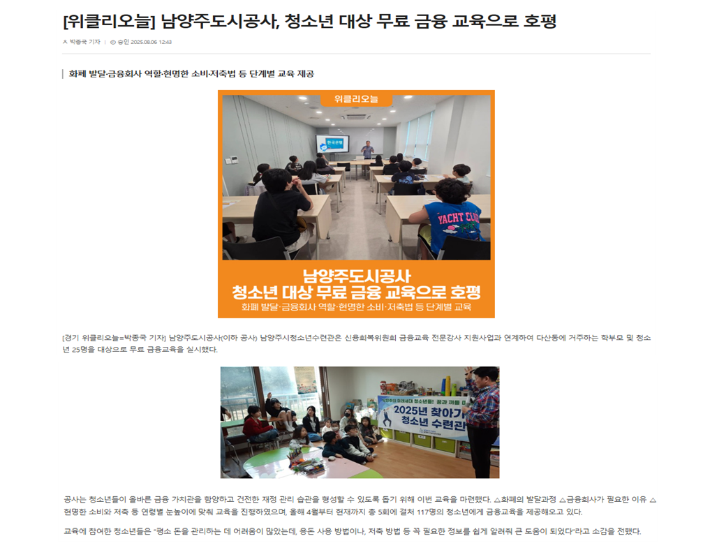 2025.07. 남양주도시공사, 청소년 대상 무료 금융 교육으로 호평 작성자 청소년수련관 등록일자 2025년 11월 26일 11시 49분 15초 조회 23 남양주도시공사, 청소년 대상 무료 금융 교육으로 호평 스크린샷 2025-08-06 181416.png [ Size : 470.5KB, Down : 25 ] 미리보기 다운로드 스크린샷 2025-08-06 181431.png [ Size : 230.01KB, Down : 27 ] 미리보기 다운로드 목록보기