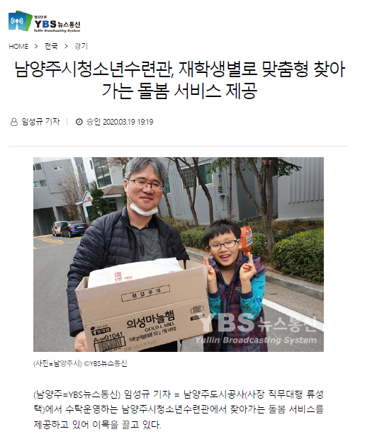 (2020.03.19.)남양주시청소년수련관, 재학생별로 맞춤형 찾아가는 돌봄 서비스 제공 작성자 청소년수련관 등록일자 2020년 3월 26일 0시 0분 0초 조회 557 전문 하단 주소 참조http://www.ybsn.tv/news/articleView.html?idxno=7652 01.png [ Size : 291.07KB, Down : 107 ] 미리보기 다운로드 목록보기