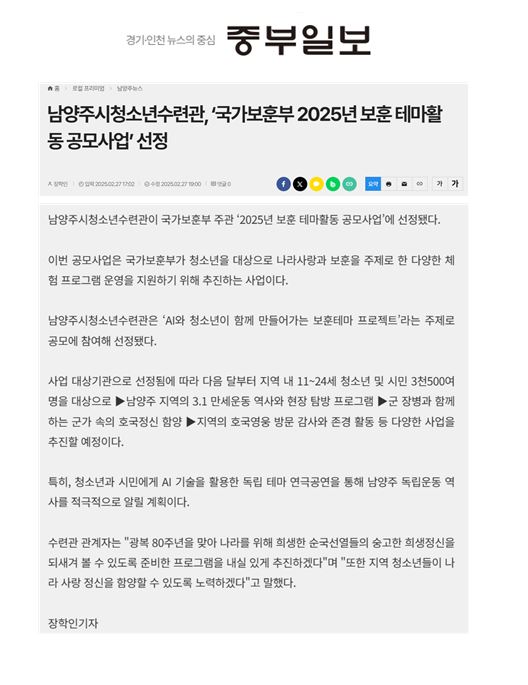 2025.02. 남양주시청소년수련관, '국가보훈부 2025년 보훈 테마활동 공모사업 선정' 작성자 청소년수련관 등록일자 2025년 11월 26일 11시 28분 11초 조회 11 남양주시청소년수련관, '국가보훈부 2025년 보훈 테마활동 공모사업 선정' 국가보훈부 2025년 보훈 테마활동 공모사업 선정 보도자료.JPG [ Size : 48.44KB, Down : 16 ] 미리보기 다운로드 목록보기