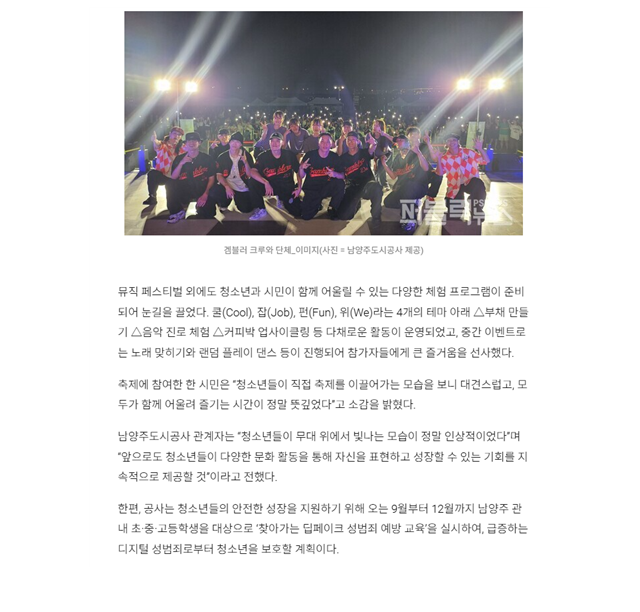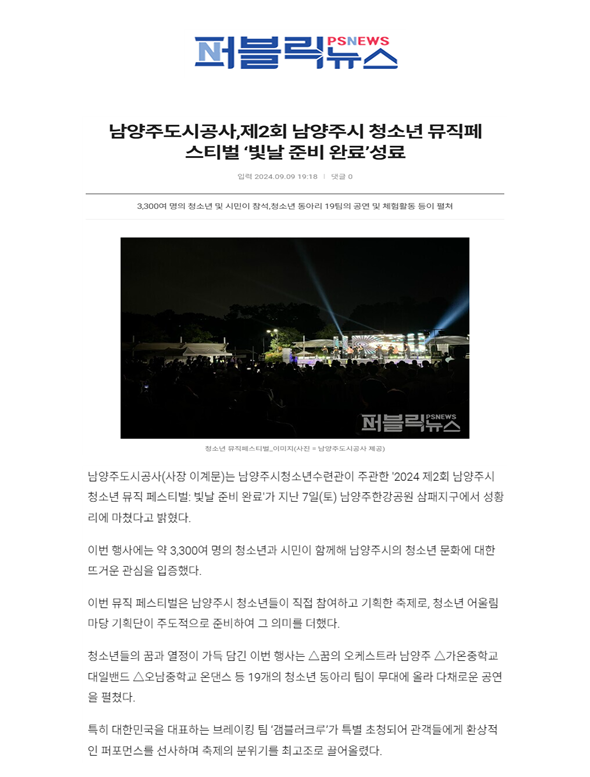 2024.09. 남양주도시공사, 제2회 남양주시 청소년 뮤직페스티벌 빛날 준비 완료 성료 작성자 청소년수련관 등록일자 2024년 12월 10일 15시 33분 59초 조회 145 남양주도시공사, 제2회 남양주시 청소년 뮤직페스티벌 '빛날 준비 완료' 성료 2024.09. 남양주도시공사, 제2회 남양주시 청소년 뮤직페스티벌 빛날 준비 완료 성료1.png [ Size : 186.72KB, Down : 114 ] 미리보기 다운로드 2024.09. 남양주도시공사, 제2회 남양주시 청소년 뮤직페스티벌 빛날 준비 완료 성료2.png [ Size : 299.04KB, Down : 115 ] 미리보기 다운로드 목록보기