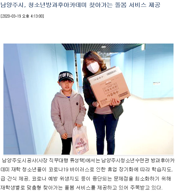 (2020.03.19.)남양주시, 청소년방과후아카데미 찾아가는 돌봄 서비스 제공 작성자 청소년수련관 등록일자 2020년 3월 26일 0시 0분 0초 조회 459 전문 하단 주소 참조http://kns.newsk.kr/bbs/bbs.asp?exe=view&group_name=361§ion=3&category=0&idx_num=20539&page=2&search_category=&search_word=&order_c=bd_idx_num&order_da=desc 01.png [ Size : 252.63KB, Down : 106 ] 미리보기 다운로드 목록보기