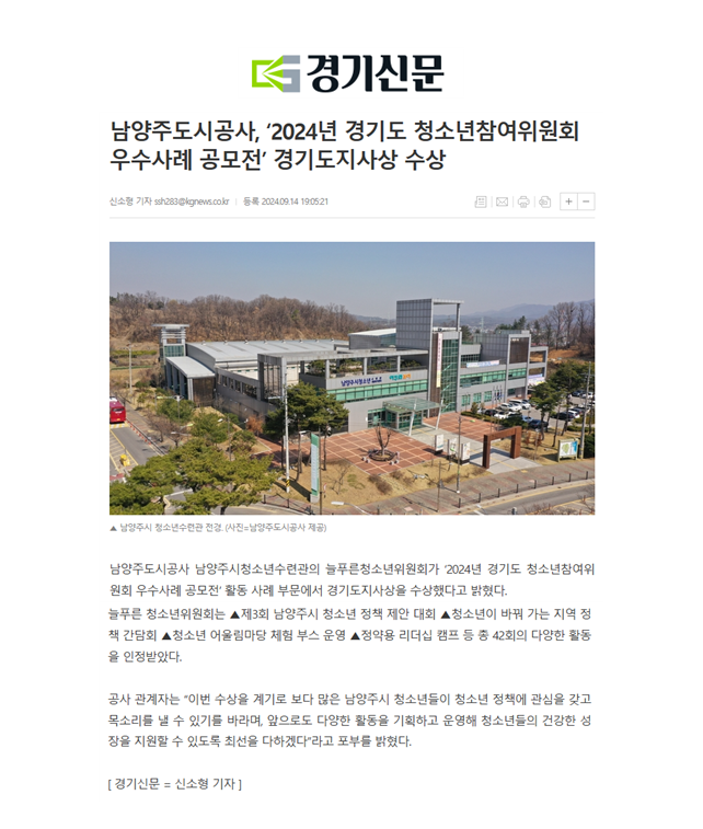 2024.09. 남양주도시공사, 2024년 경기도 청소년참여위원회 우수사례 공모전 경기도지사상 수상 작성자 청소년수련관 등록일자 2024년 12월 10일 15시 34분 55초 조회 183 남양주도시공사, '2024년 경기도 청소년참여위원회 우수사례 공모전' 경기도지사상 수상 2024.09. 남양주도시공사, 2024년 경기도 청소년참여위원회 우수사례 공모전 경기도지사상 수상1.png [ Size : 379.56KB, Down : 102 ] 미리보기 다운로드 목록보기