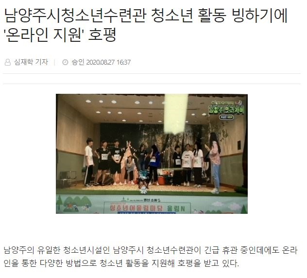 (2020.08.) 남양주시청소년수련관 청소년 활동 빙하기에 '온라인지원' 호평