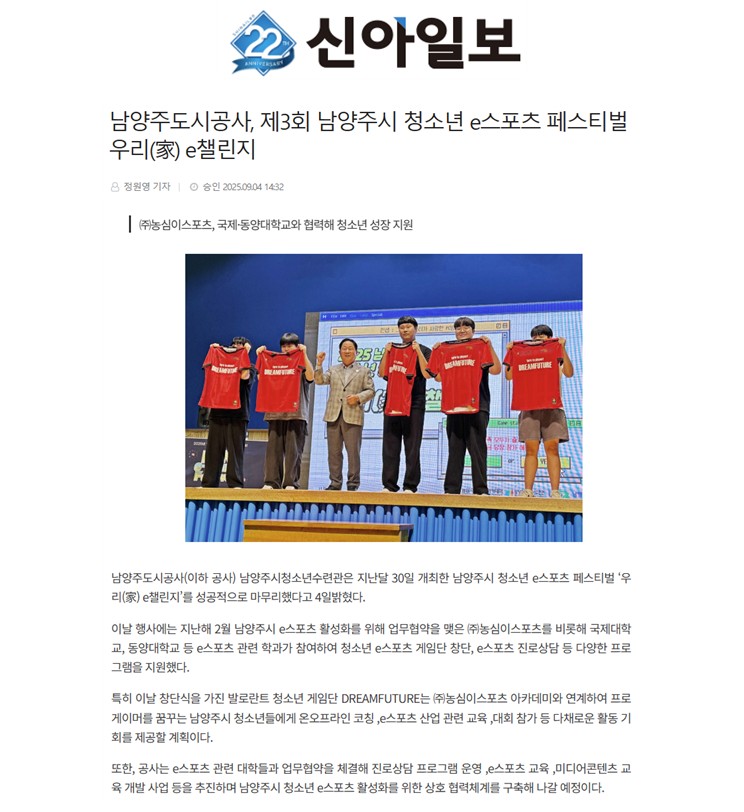 2025.09. 남양주도시공사, 제3회 남양주시 청소년 e스포츠 페스티벌 우리(家) e챌린지 작성자 청소년수련관 등록일자 2025년 11월 26일 13시 5분 29초 조회 29 남양주도시공사, 제3회 남양주시 청소년 e스포츠 페스티벌 우리(家) e챌린지 - 신아일보남양주시 청소년 e스포츠 페스티벌 ‘우리(家) e챌린지’ 성료 < 경기 < Regions < 기사본문 - 퍼블릭뉴스통신(Public news-network for TTL)[위클리오늘] 남양주도시공사, 제3회 남양주시 청소년 e스포츠 페스티벌 ‘우리(家) e챌린지’ 개최 < 경기 < 전국지사 < 기사본문 - 위클리오늘 남양주도시공사, 제3회 남양주시 청소년 e스포츠 페스티벌 우리(家) e챌린지 1.jpg [ Size : 116.51KB, Down : 29 ] 미리보기 다운로드 남양주도시공사, 제3회 남양주시 청소년 e스포츠 페스티벌 우리(家) e챌린지 2.jpg [ Size : 20.09KB, Down : 25 ] 미리보기 다운로드 목록보기