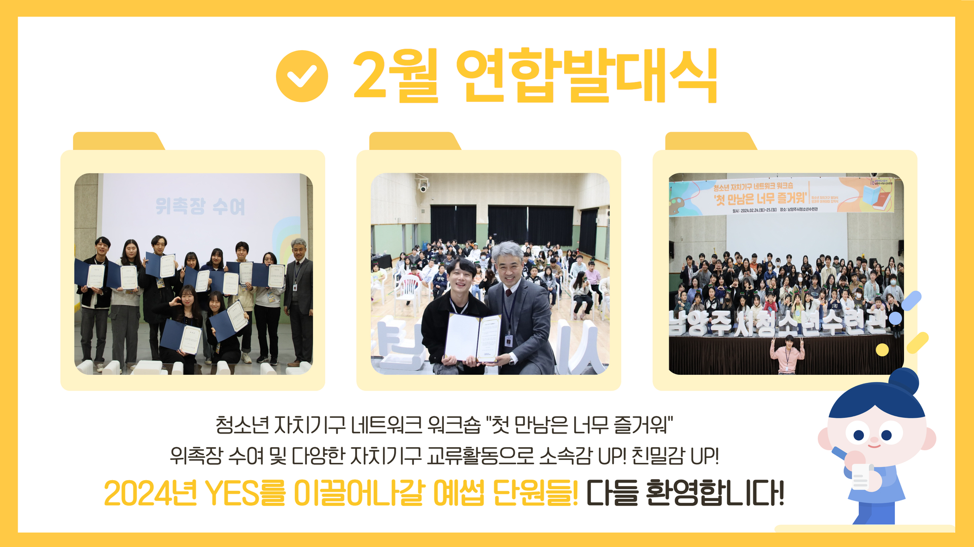 [대학생서포터즈] 2월 연합발대식 작성자 청소년수련관 등록일자 2024년 3월 14일 8시 57분 26초 조회 215 예썹_2월.jpg [ Size : 405.28KB, Down : 93 ] 미리보기 다운로드 예썹_2월_2.jpg [ Size : 1MB, Down : 97 ] 미리보기 다운로드 목록보기