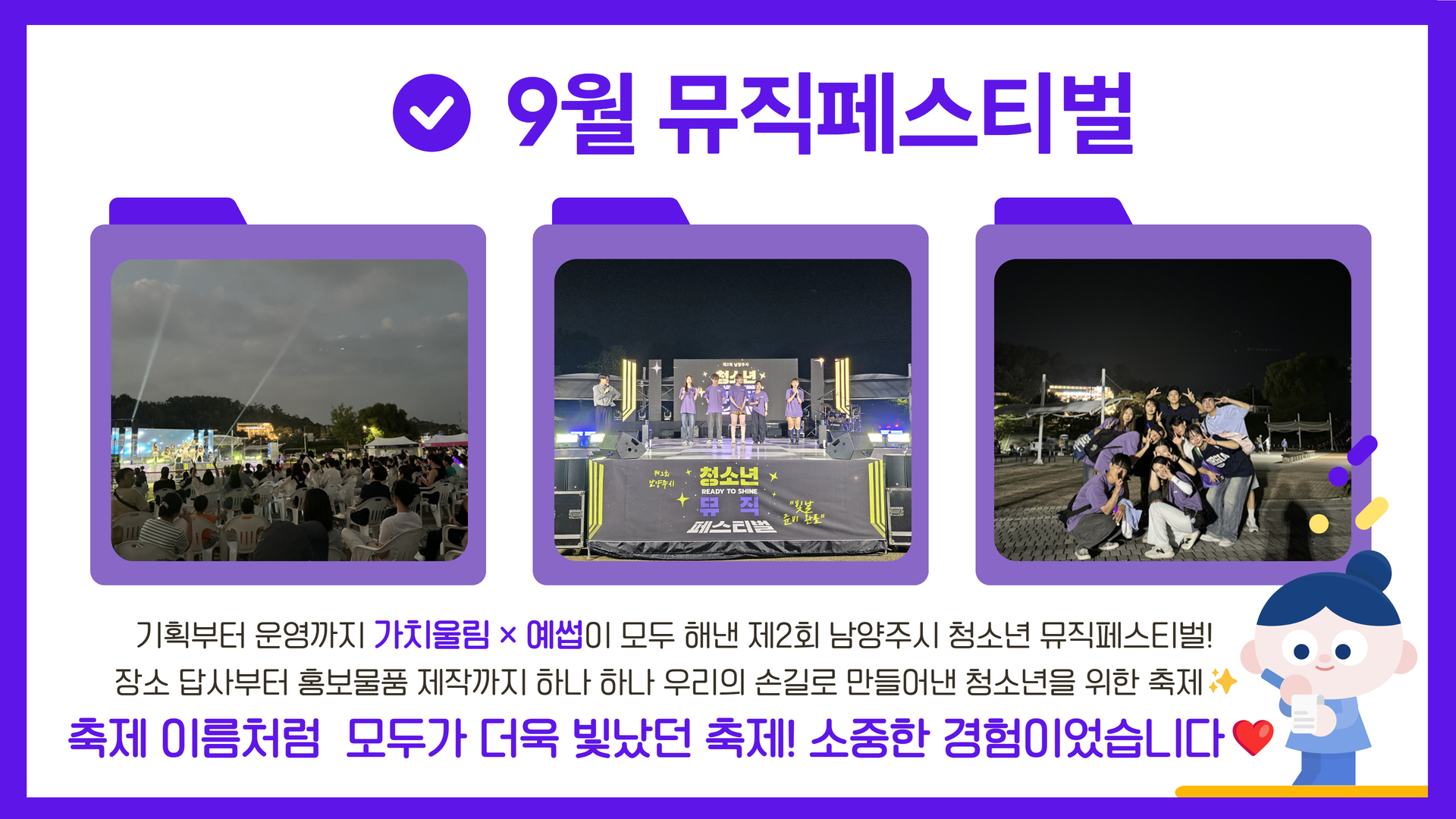 [대학생서포터즈] 9월 뮤직페스티벌 작성자 청소년수련관 등록일자 2024년 12월 27일 16시 31분 50초 조회 133 예썹_9월.jpg [ Size : 425.8KB, Down : 76 ] 미리보기 다운로드 예썹_9월_2.jpg [ Size : 1.06MB, Down : 73 ] 미리보기 다운로드 목록보기
