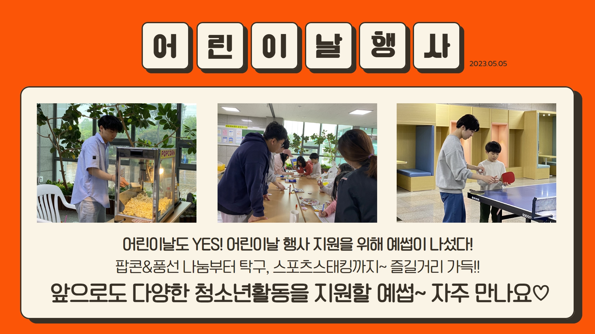 [대학생서포터즈] 5월 어린이날 행사 작성자 청소년수련관 등록일자 2023년 5월 6일 14시 14분 55초 조회 214 예썹 5월 어린이날 행사 지원.jpg [ Size : 203.76KB, Down : 117 ] 미리보기 다운로드 예썹 5월 어린이날 행사 지원_2.jpg [ Size : 765.56KB, Down : 131 ] 미리보기 다운로드 목록보기