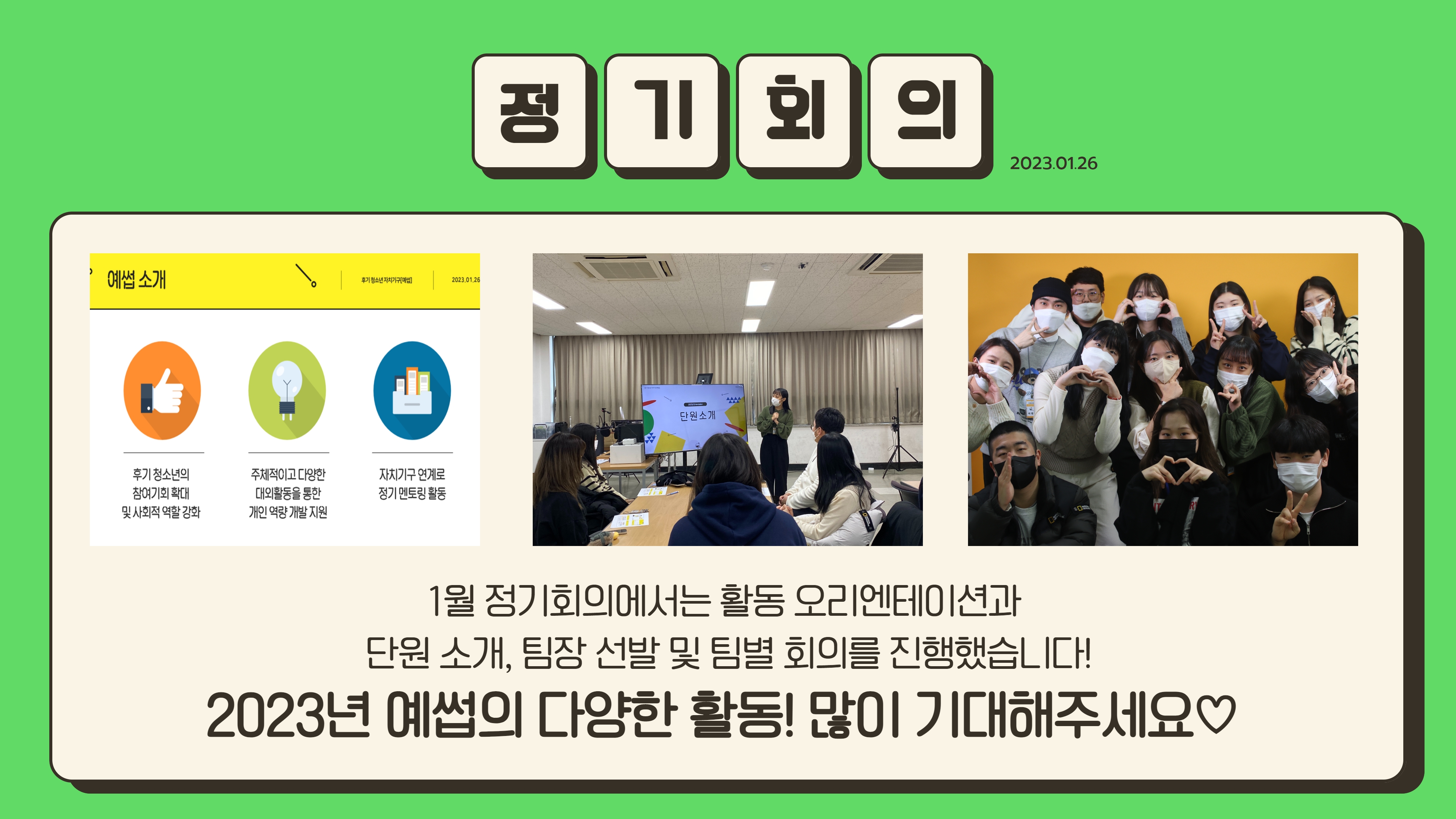 [대학생서포터즈] 1월 정기회의 작성자 청소년수련관 등록일자 2023년 2월 3일 13시 58분 7초 조회 215 예썹 1월 정기회의.jpg [ Size : 373.83KB, Down : 106 ] 미리보기 다운로드 예썹 1월 정기회의_2.jpg [ Size : 1.63MB, Down : 113 ] 미리보기 다운로드 목록보기