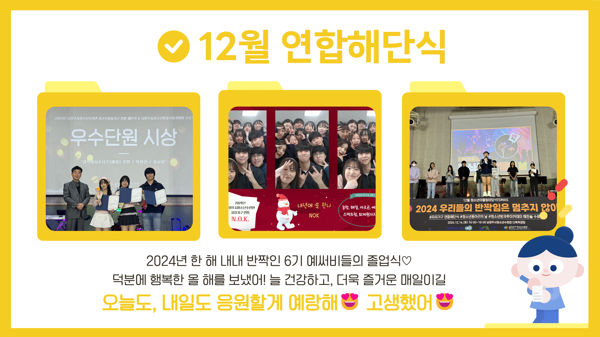 [대학생서포터즈] 12월 연합해단식 작성자 청소년수련관 등록일자 2024년 12월 31일 21시 11분 56초 조회 173 예썹_12월.jpg [ Size : 372.51KB, Down : 89 ] 미리보기 다운로드 예썹_12월_2.jpg [ Size : 1.04MB, Down : 91 ] 미리보기 다운로드 목록보기