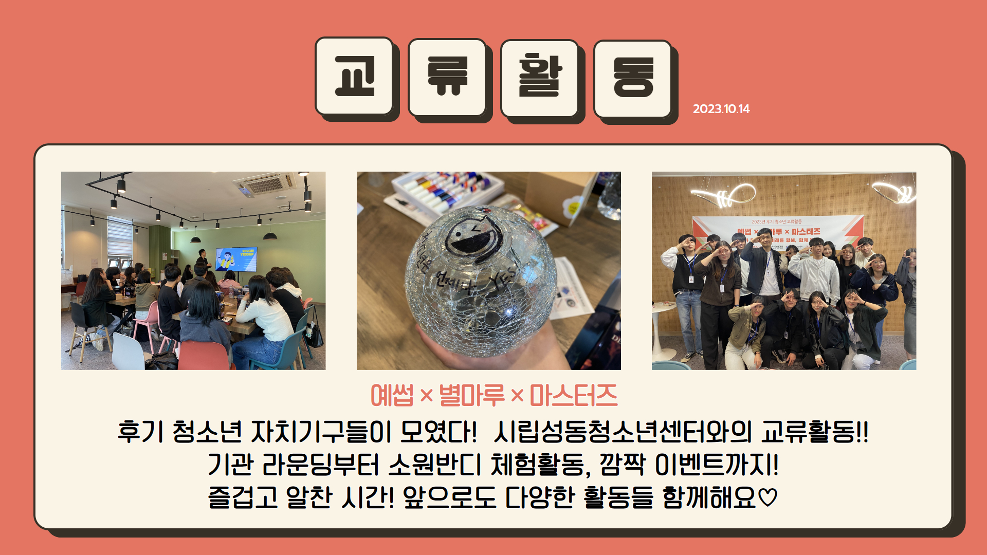 [대학생서포터즈] 10월 교류활동 작성자 청소년수련관 등록일자 2023년 12월 20일 9시 42분 25초 조회 149 예썹 10월 교류활동_1.jpg [ Size : 259.55KB, Down : 82 ] 미리보기 다운로드 예썹 10월 교류활동_2.jpg [ Size : 1.17MB, Down : 86 ] 미리보기 다운로드 목록보기