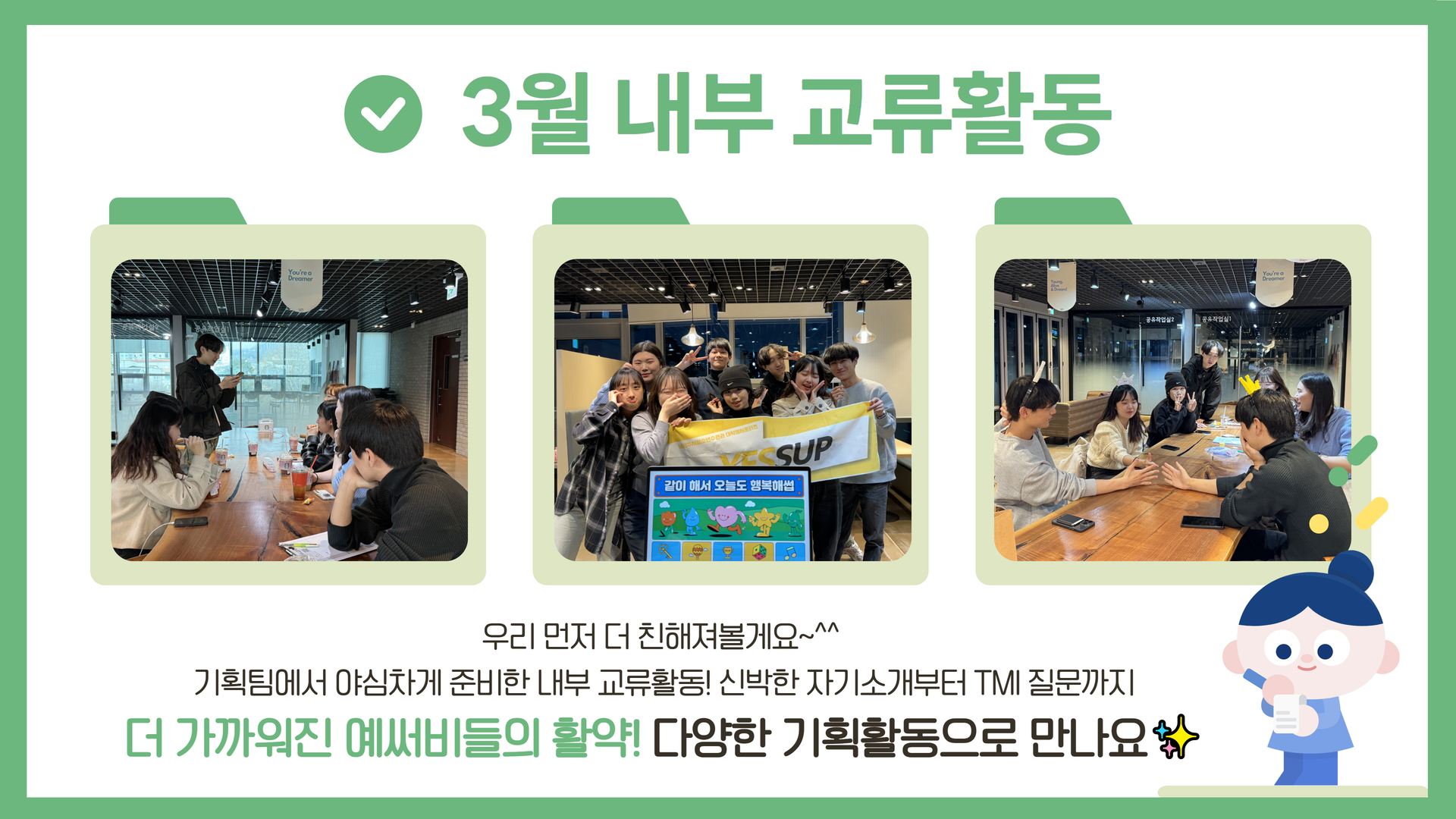 [대학생서포터즈] 3월 내부 교류활동 작성자 청소년수련관 등록일자 2024년 3월 17일 11시 45분 4초 조회 191 예썹_3월.jpg [ Size : 365.05KB, Down : 91 ] 미리보기 다운로드 예썹_3월_2.jpg [ Size : 1.13MB, Down : 98 ] 미리보기 다운로드 목록보기