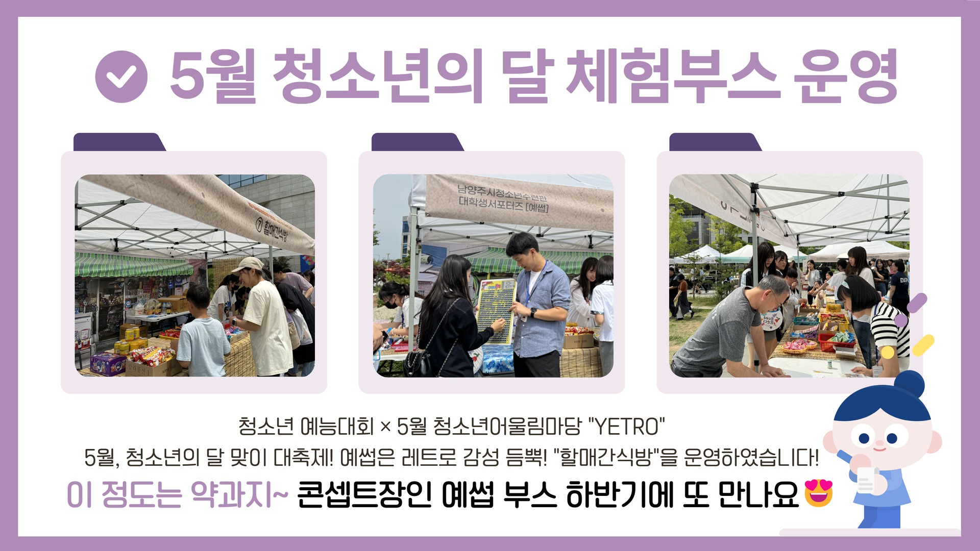 [대학생서포터즈] 5월 청소년의 달 작성자 청소년수련관 등록일자 2024년 8월 3일 19시 37분 21초 조회 179 예썹_5월.jpg [ Size : 343.43KB, Down : 93 ] 미리보기 다운로드 예썹_5월_2.jpg [ Size : 1.13MB, Down : 84 ] 미리보기 다운로드 목록보기