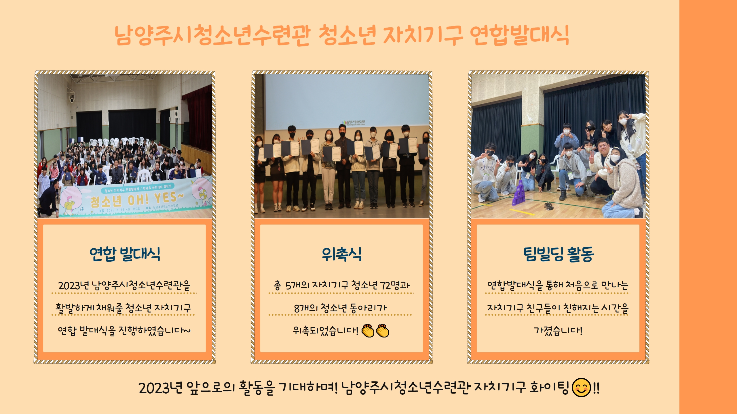 3월 청소년자치기구 연합발대식 작성자 청소년수련관 등록일자 2023년 6월 16일 11시 12분 19초 조회 193 연합발대식 1.jpg [ Size : 526.08KB, Down : 104 ] 미리보기 다운로드 연합발대식 2.jpg [ Size : 1.33MB, Down : 96 ] 미리보기 다운로드 목록보기