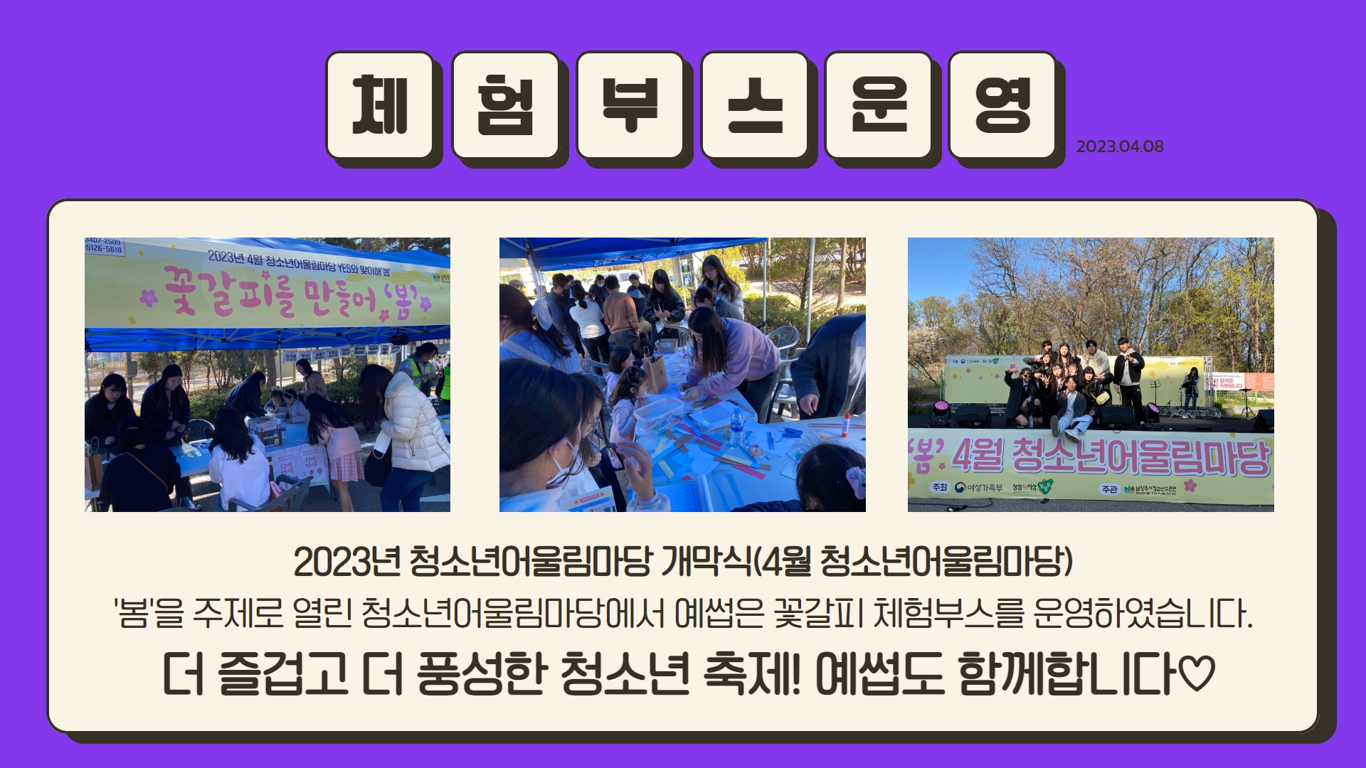 [대학생서포터즈] 4월 체험부스 운영 작성자 청소년수련관 등록일자 2023년 4월 11일 14시 31분 40초 조회 186 예썹 4월 체험부스 운영.jpg [ Size : 199.81KB, Down : 106 ] 미리보기 다운로드 예썹 4월 체험부스 운영_2.jpg [ Size : 865.09KB, Down : 118 ] 미리보기 다운로드 목록보기
