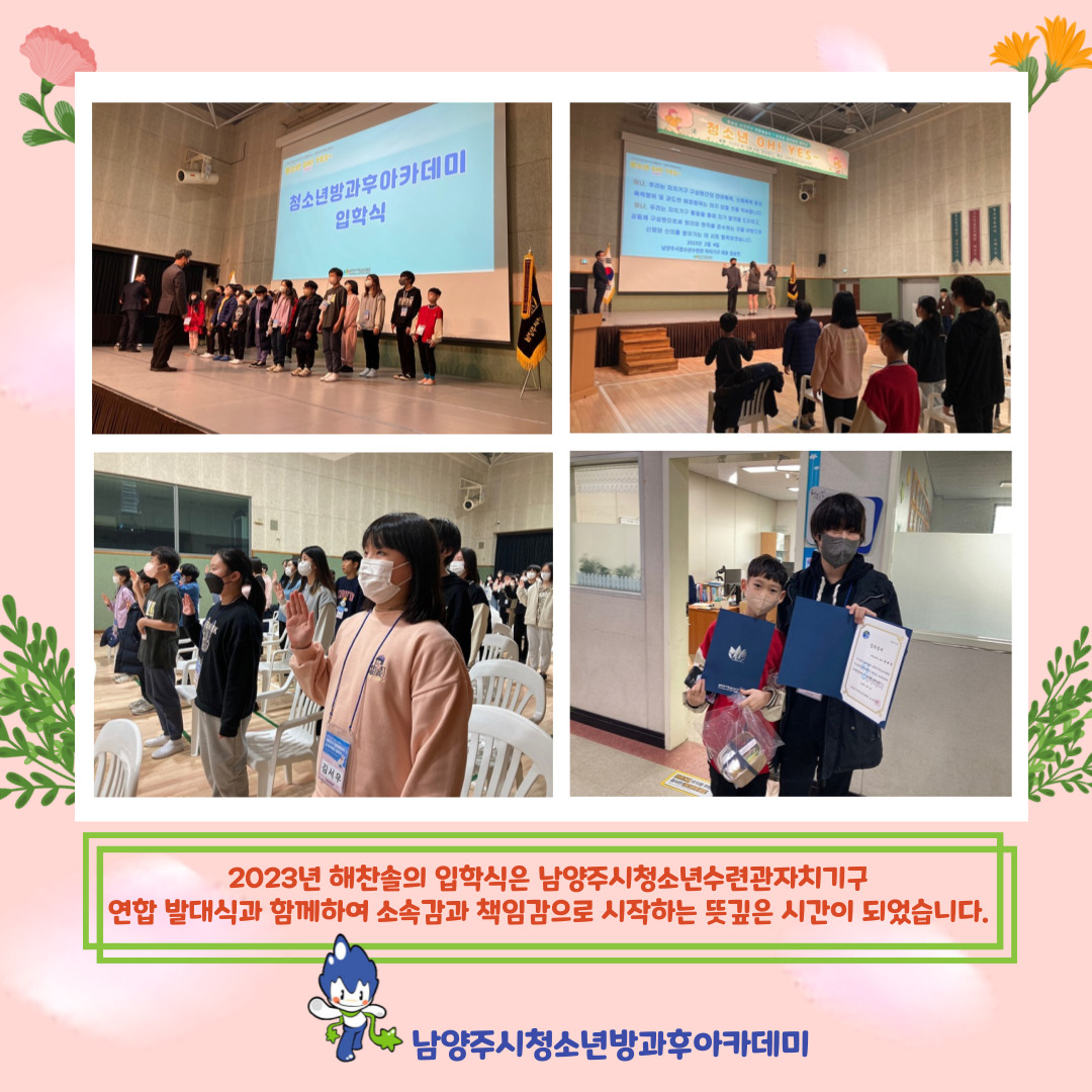 2023년 남양주시청소년방과후아카데미 입학식 작성자 청소년수련관 등록일자 2023년 3월 13일 14시 24분 31초 조회 239 2023년 3월 4일 우리 해찬솔의 입학식이 있었습니다.1년 동안 우리 친구들과 함께하는 다양한 활동과 도전으로 성장하는 한 해 만들겠습니다.^^ 1.jpg [ Size : 231.42KB, Down : 173 ] 미리보기 다운로드 2.jpg [ Size : 351.24KB, Down : 187 ] 미리보기 다운로드 목록보기