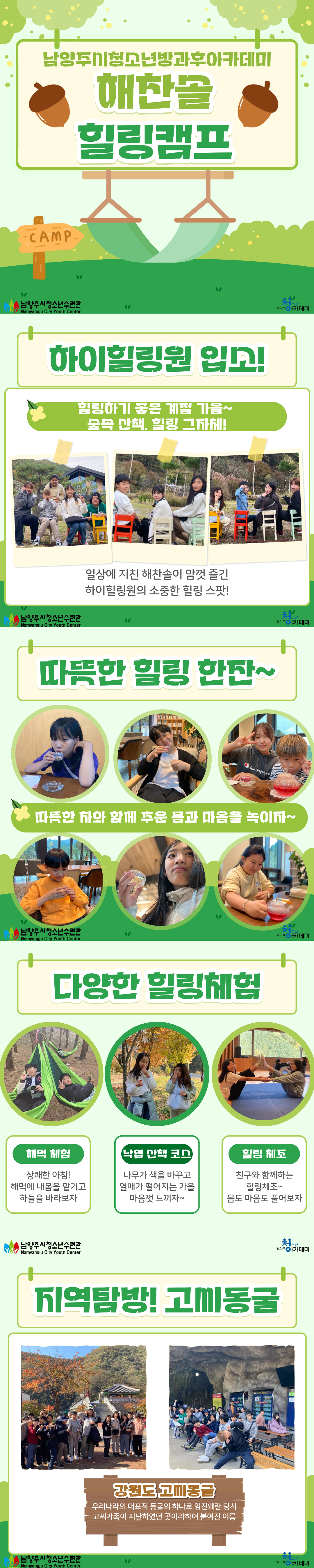 [남양주시청소년방과후아카데미] 해찬솔 힐링하러 가다!! : 하이힐링원과 함께하는 행위중독캠프! 작성자 청소년수련관 등록일자 2025년 11월 18일 11시 35분 1초 조회 54 하이힐링원과 함께한 해찬솔 2박3일 캠프!! 강원도의 가을을 마음껏 느끼고 온 해찬솔 스마트폰은 잠시 내려놓고 풍경과 체험으로 가득찬 캠프였습니다! 힐링캠푸푸.png [ Size : 4.35MB, Down : 41 ] 미리보기 다운로드 목록보기