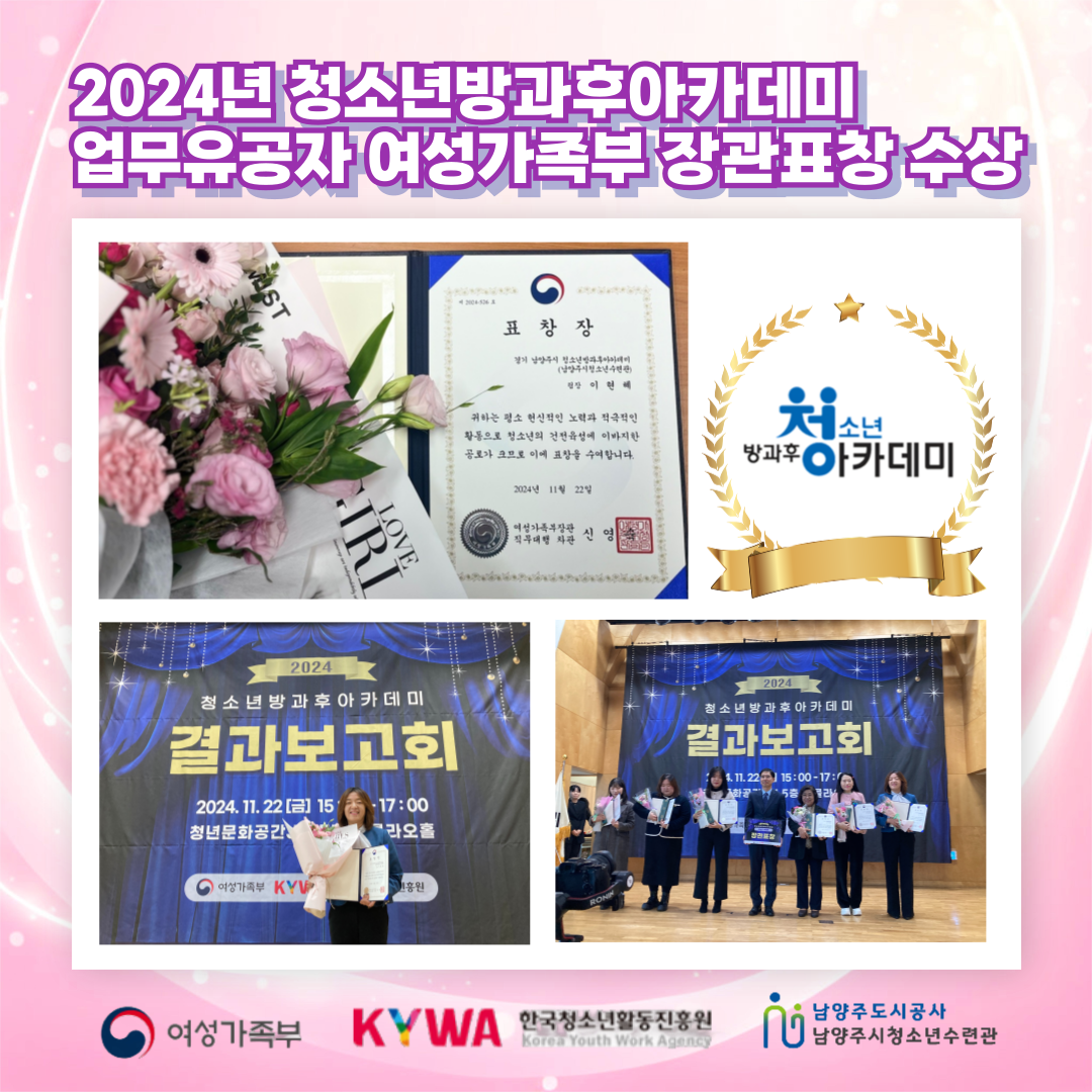 2024년 청소년방과후아카데미 결과보고회에서 청소년의 건전육성에 이바지한 공로를 인정받아 남양주시청소년방과후아카데미 이현혜 팀장님이 업무유공자 여성가족부 장관 표창을 수상하였습니다.~ ^^