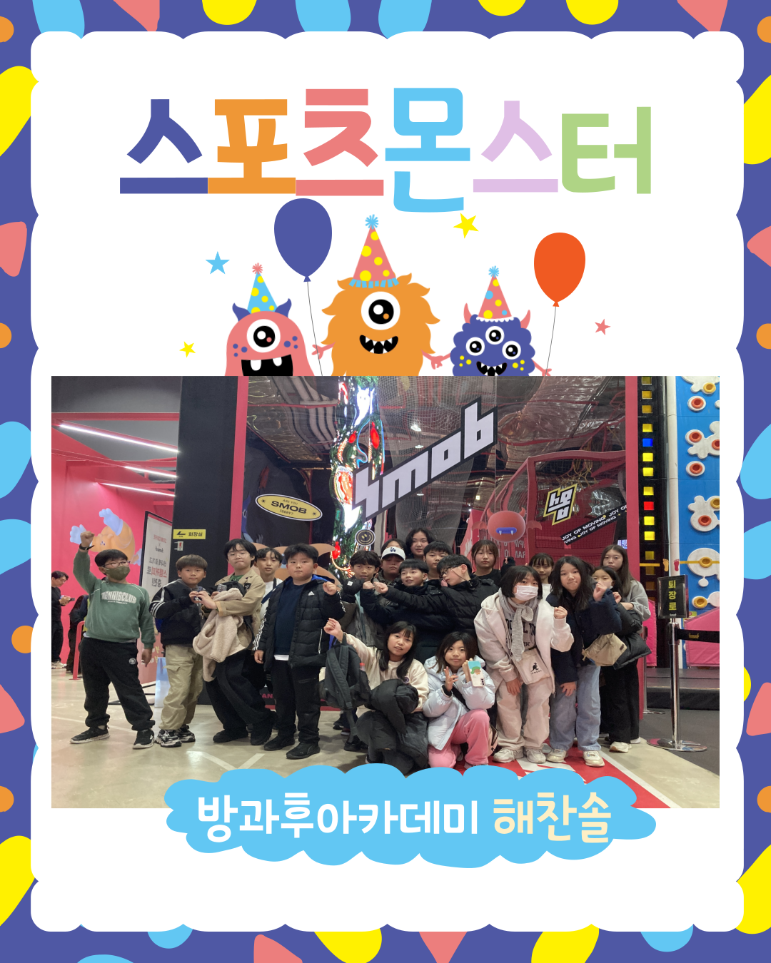 2025년 청소년방과후아카데미 해찬솔은 스포츠몬스터를 방문하여 다양한 스포츠 활동을 직접 체험하였습니다. 청소년들은 새로운 종목에 도전하며 즐거움과 성취감을 느꼈고, 협동심과 자신감을 키우는 뜻깊은 시간이 되었습니다.