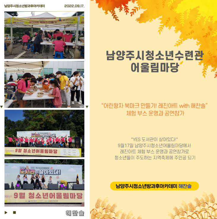 9월17일 토요일 우리 해찬솔은 남양주시청소년수련관에서 준비한 어울림마당에서 체험부스를 운영했습니다.