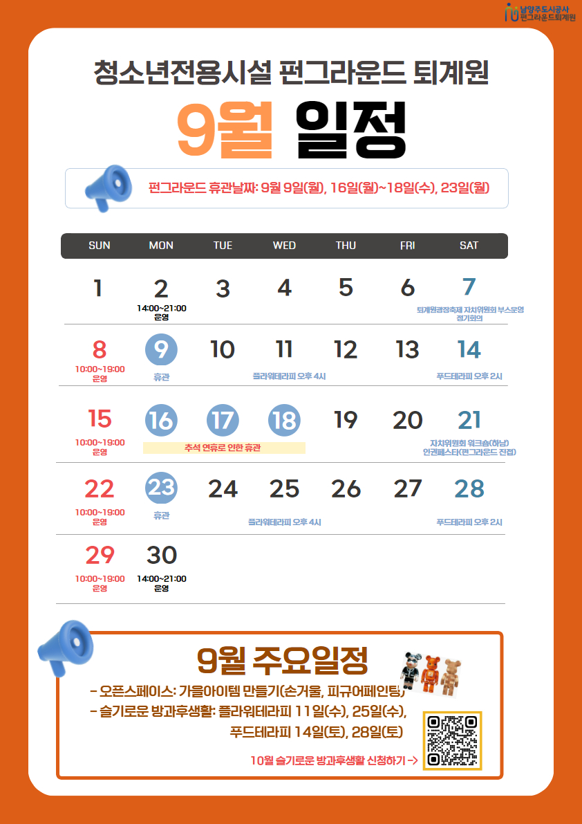 청소년전용공간! 청소년이용시설인 펀그라운드 퇴계원의 9월 일정을 안내드립니다~