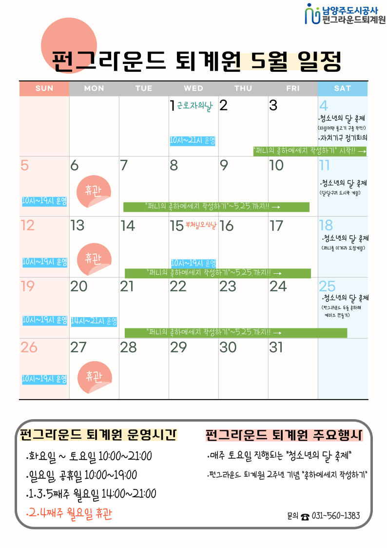 퇴계원 [공지] 펀그라운드 퇴계원 5월 일정 작성자 펀그라운드진접 등록일자 2024년 4월 30일 19시 45분 20초 조회 362 [공지] 펀그라운드 퇴계원 5월 일정 5월 펀그라운드 퇴계원 일정을 공유합니다!!<주요일정>- 매주 토요일마다 진행되는 "청소년의 달 축제"- 펀그라운드 퇴계원 2주년 기념 "축하메세지 작성하기"문의) 031-560-1383 제목을-입력해주세요__복사본-001 (2).png [ Size : 187.62KB, Down : 145 ] 미리보기 다운로드 목록보기