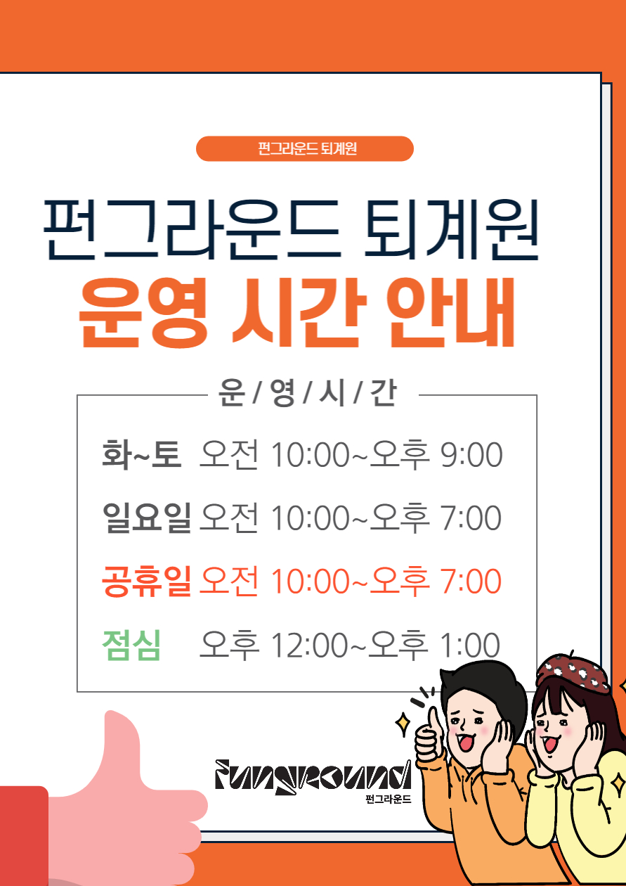퇴계원 펀그라운드 퇴계원 운영 시간 안내 작성자 펀그라운드 퇴계원 등록일자 2022년 9월 7일 16시 53분 25초 조회 392 제목을 입력해주세요_-001 (8).jpg [ Size : 365.17KB, Down : 200 ] 미리보기 다운로드 목록보기