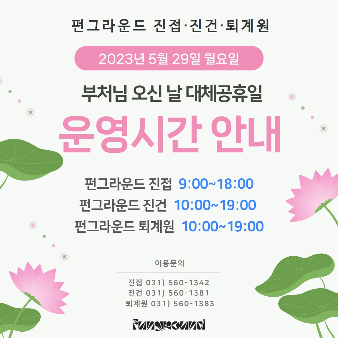 퇴계원 5월29일(월) 부처님오신날 대체공휴일 운영 안내 작성자 펀그라운드진접 등록일자 2023년 5월 28일 15시 55분 1초 조회 458 - 펀그라운드 퇴계원 5월29일(월) 부처님오신날 대체공휴일 운영 안내 -오전 10시~오후 7시까지 정상운영합니다. 펀그라운드 퇴계원 이용하고 싶은 청소년들은 운영 시간을 확인하고 방문해주세요. 대체공휴일 공지_3개소.jpg [ Size : 279.96KB, Down : 154 ] 미리보기 다운로드 목록보기