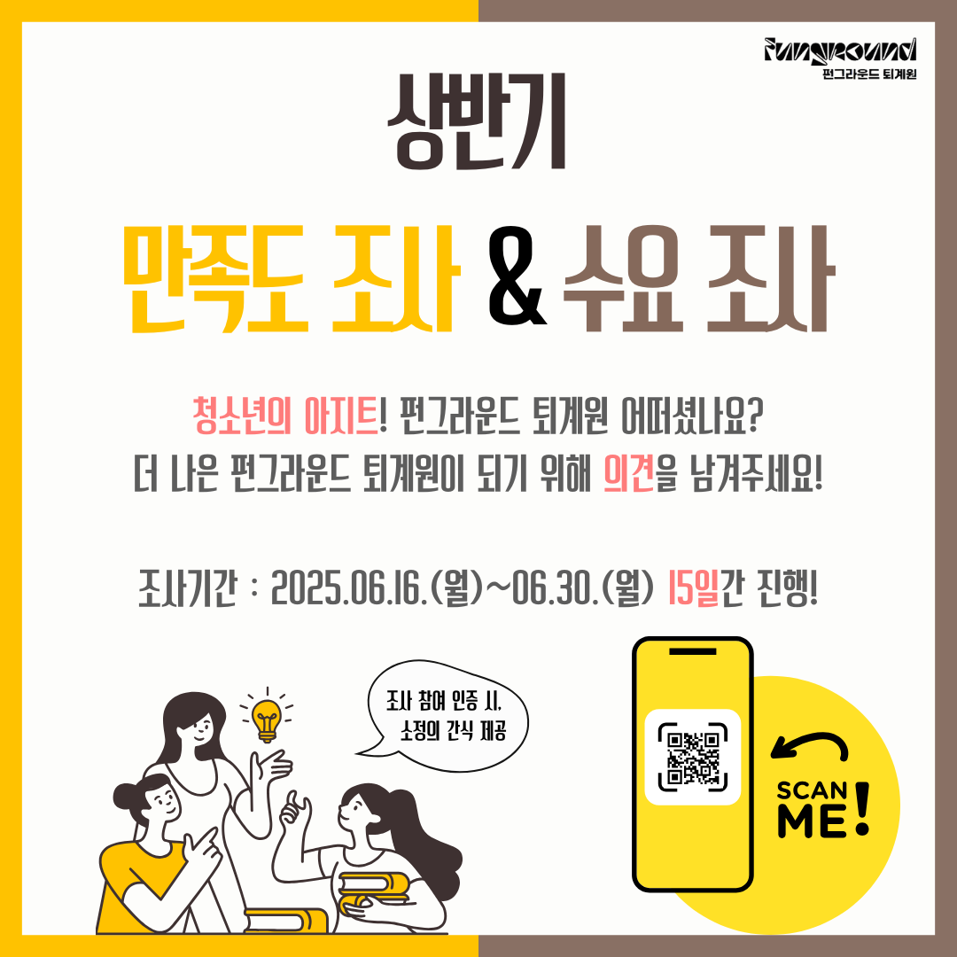 퇴계원 [안내] 상반기 만족도 및 수요조사 실시 작성자 펀그라운드 퇴계원 등록일자 2025년 6월 14일 9시 13분 6초 조회 160 노란색와 브라운 심플하고 깔끔한 대학생 일러스트 기업 서포터즈 모집 안내 취업 홍보 카드뉴스 인스타그램 게시물 (1).png [ Size : 157.03KB, Down : 61 ] 미리보기 다운로드 목록보기