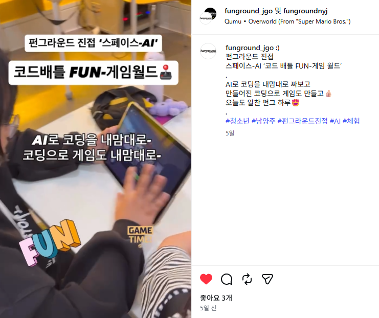 진접 스페이스-AI 4월 테마활동 코드배틀 FUN-게임월드 작성자 펀그라운드진접 등록일자 2026년 4월 23일 19시 10분 28초 조회 11 KakaoTalk_20260423_185318090.png [ Size : 471.7KB, Down : 3 ] 미리보기 다운로드 목록보기