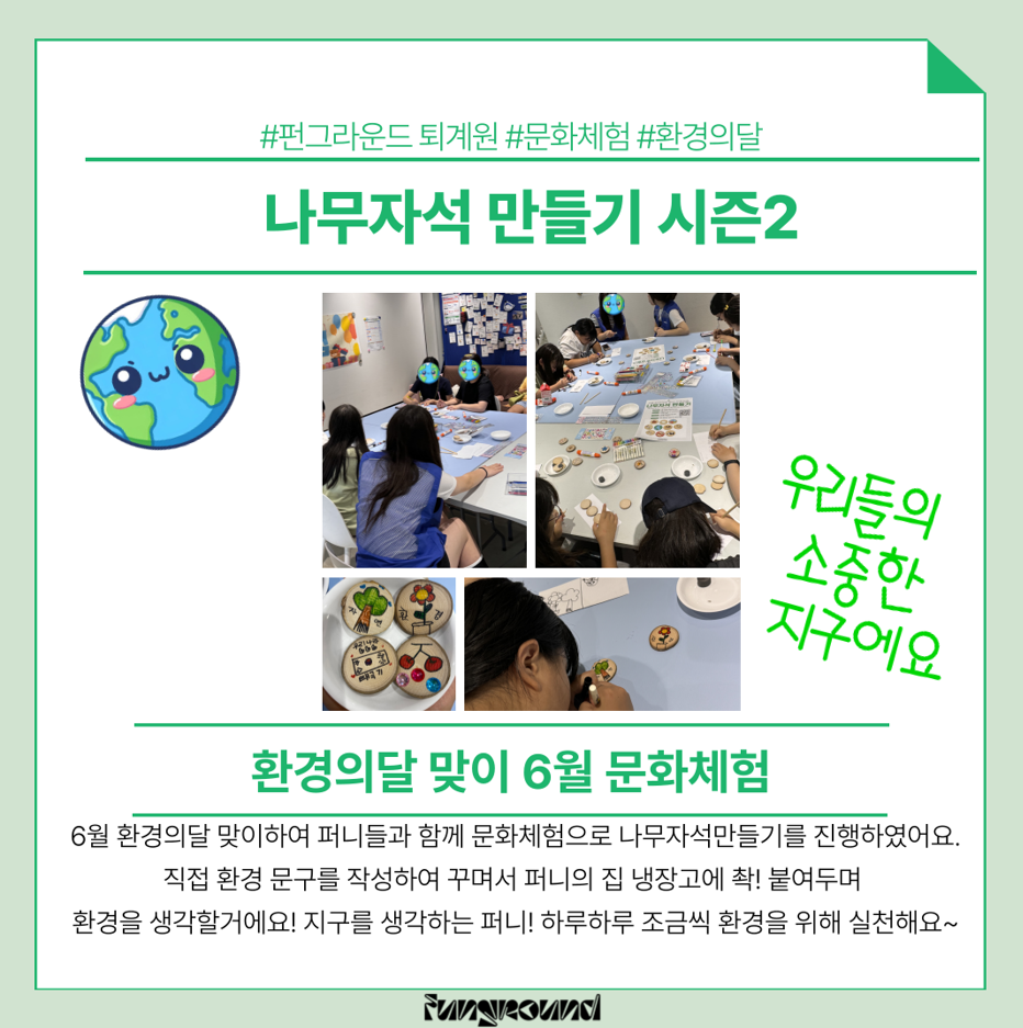 퇴계원 [펀그라운드 퇴계원] 6월 문화체험 작성자 펀그라운드진접 등록일자 2024년 6월 22일 16시 0분 36초 조회 259 [펀그라운드 퇴계원 문화체험]6월 22일 비가 주륵주륵 내리는 토요일!퍼니들과 함께 환경을 생각하며 문화체험을 진행했어요~지구가 아파서 날씨도 점점 더워지고있는데요. 이번 기회에 퍼니들은 지구를 생각하는 시간이였답니다! 7월 문화체험도 많관부! 스크린샷 2024-06-22 152620.png [ Size : 465.27KB, Down : 111 ] 미리보기 다운로드 목록보기